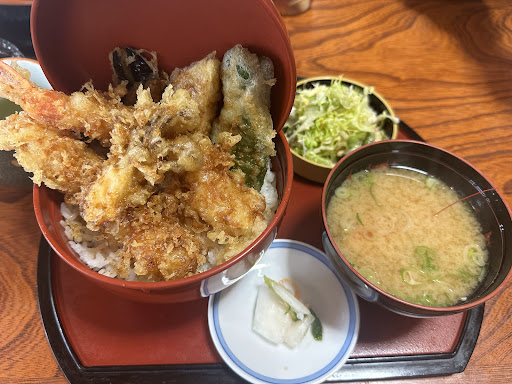 ランチメニューは1000〜1500円ほどで日替わりや天丼、ちらしや中華そばなど目移りしてしまうものばかり! 迷いに迷って、大きな海老海老天丼を注文しました。 10分ほどで着丼🍚サクサクの天ぷらで、衣でかさ増しなど一切なくメニュー名の通りの大きな海老天が2本ッ🦐🤍 更に海老汁とサラダ、お新香もついてきました。 とてもボリューミーで食べ応えありますが、サクサクの天ぷらなので、さくさくと食べ進めてしまいました😂👏🏻 タレもしっかりかかっていて、お味噌汁も濃いめで全体的にしっかり目の味付けでした。