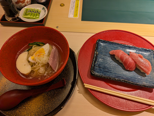 Read more新規開拓にて訪問。もとは回ったんだろうか?現在は注文した商品だけがラインを流れて、テーブルまで入ってくるタイプの回転寿司。一つ一つのネタは新鮮で美味しいし、タッチパネルでの注文なので客の注文にはそれほどストレスはない。一つ言うなら一品一品がテーブルに着くまでが、普通の回転寿司の基準で待つと時間がかかるように感じるかも。こういうものかなと思えばそれほど強いストレスにはならないだろう。 寿司ネタ以外にもサイドメニューはあるが、料理としてはクオリティが高いと思う。一緒に頼んだものが、一皿で配膳されたりする。昨今のご飯少なめも選べる品があって女性には嬉しい。