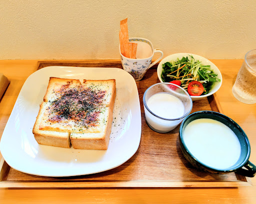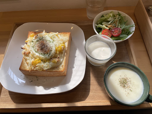 他の方のレビューを見ていて、チーズケーキが食べたい!!と思っていたけど朝ごはんなので今回はガマン。 トーストもすごく好評だったので、悩みに悩んでスパイシーチーズトーストを頼みました(どうしてもチーズが欲しかったようだ…笑)。 いや、でもフレンチトーストもあんバタートーストも気になった!! 季節で変わる土手トーストというのが売り?なのかな?と思いつつ、苦手な食材が入っていたので今回は見送り。次のを楽しみにしたい(でも他のお客さんの話を聞いてるとめちゃくちゃ美味しそう)。 それにしたってお安い!! トースト系は500円以下。 それにセットでサラダ(ミニトマト、水菜、レタス、塩?コショウ系?さっぱりドレッシング)と飲むヨーグルト(多分。ヨーグルトよりさらっとしてたので)とスープ(今回はさつまいもポタージュだったんだけどこれがとにかく体に染みた…あと塩系サラダと相性が良すぎる…)をつけ、 コーヒー(食事を頼むと安くなる!)もつけて1000円!! 贅沢〜! 今回頼んだスパイシーチーズトーストはスライスチーズにコショウ?やハーブをかけてるトーストしたもの。 このトーストが!分厚くて美味しい!!分厚いのにふわふわで、気づくと食べ終わっていた…笑 食べきれなかったらという不安をよそに程よい量で大満足でした(さすがにチーズケーキは食べられなかったけど)。