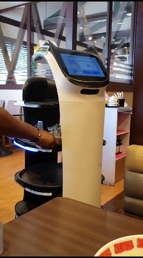 注文を頼んだら調理されたものがイオンで走っているロボットで運ばれてくる。体積が大きいのに小回りが効いてなかなか優れものである。