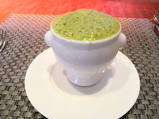 スープは少し苦味がある地元産のそら豆 旨味が凝縮された富山の白海老のフリッターが添えられている