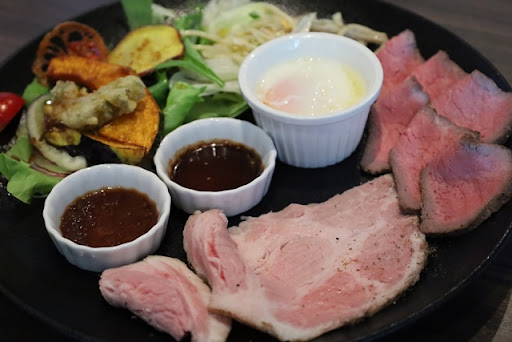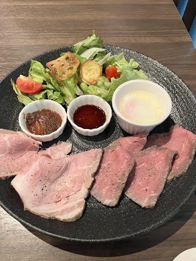 The brunch is satisfying without being too heavy — it leaves you feeling comfortable and content. The low-temperature-cooked pork and roast beef are served with a special sauce that tastes great, along with a small bowl of rice and a soft-boiled onsen egg, making the meal well-balanced and nutritious. The fried lotus root chips are quite tasty, though the portion of salad on the side is a bit small. The soup, made purely from vegetables, feels pleasantly warming after you finish it.