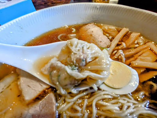10分程でワンタン麺到着。 スープは煮干し香る永福町系統のスープ。ワンタンはトゥルットゥルッの皮を楽しむ系かな?お箸で掬うのは難しいタイプですね。 具に関しては、他店ではナルトが無かったりとかですけど、こちらでは全部乗せ的なので見た目は満足です。特に毛呂山特産?の柚子の香りが良かったと思います。 麺は1.5玉でワンタン分を考慮しての量なのですかね?最初の一口目は若干他の永福町系より硬めに感じました。 表面を覆うラードも効いており、最後まで熱々で美味しく頂きました。