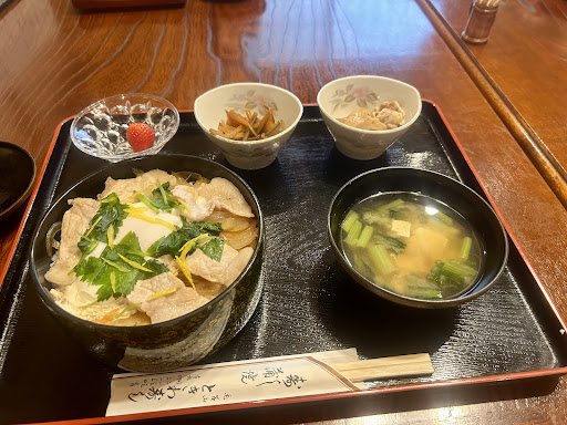 個室に案内されて(個室しかないみたい) 今回は初訪問なのでまずは名物の豚卵毛丼(ぶったまげどん)と相方はカツ重を注文 注文から10分程で着丼!中々のボリュームと付け合わせが嬉しい! デザートのイチゴがかわいい ぶったまげ丼は柚子がとても良いアクセントになっていてお肉も柔らかくあっという間に完食(笑) 相方が注文したカツ重もボリューム満点で女性には多かったみたいで食べきれない様なので少し頂きました。 カツ重なので卵でとじているのに何故かカツがサクサクする!甘めの味付けがとても合う...美味い