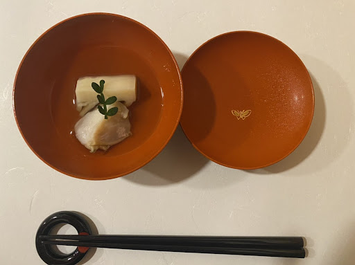 〈肴〉 一品目:本部町産今朝採れ野菜 (トマト2種、アスパラ、自家製味噌(ヒルトン瀬底で販売)、新島産塩) 二品目:お吸い物 (白子、京都産たけのこ(朝どれ航空便)、アーサーの青草、沖縄産花山椒) 三品目:岩手産牡蠣(沖縄深層水に48時間漬けて浄化+シークワーサーの香り)+海ブドウ しまらっきょのなめろう ゆし豆腐+ふぐ白子 からすみ(左塩漬け、右味噌漬け) スティックブロッコリー+島にんじん 四品目(御造里) 左上:沖縄県産ちびまぐ 沖縄県産まぐろ血合い部分 (鮮度が良いので食べれる) 左下:沖縄県産しろいか (あおりいか;上が本日、下が5日間締め) 左下:伊勢海老昆布締め 真中:とらふぐ 右上:ミイバエ(クエ) 沖縄県産塩二種(屋我地島(やがじしま)産) 静岡産わさび(沖縄は硬水のため栽培が難しい) 五品目:沖縄県産パインすっぽん