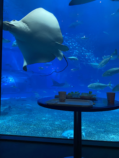 Read moreWe paid the extra 500 yen for reserved window seats. We did wait a good hour plus until seated for these seats. The reserved window seats are allotted 40 minutes whereas the unreserved seats (less wait time) are allotted 60 minutes for seated time. I loved the view from our paid seats, however, the tables behind us, got pretty much the same view without paying, and could sit 20 minutes longer to enjoy the views. The food was OK. We ordered the fish and chips (tough fish, stale chips) and the squid ink pasta (it's food court quality, but much better than the fish and chips). Also had the lemon tart, which was very flavorful. All in all, it was a been there done that experience. If I were to visit the cafe again, I would do the unreserved seating, and probably do coffee and dessert while enjoying the view. 3 stars simply for the value, quality of food, and our wait time. The window seating is a 4 -5 star, because it was so relaxing being that close to the sea animals and watching them...