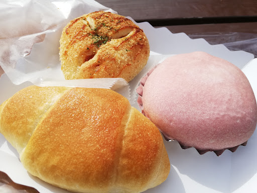 塩バターパンはバターの風味が強く感じられます。表面はカリッとしていますが、生地は頑な感じです。 明太チーズパンはクリームチーズがたっぷりですが明太子は少なめ。 桃のパンは甘さ控えめの桃クリームと、おまけ程度の黄桃の果肉入り。思ったよりあっさりしていました。