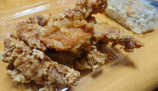 唐揚げ、一つ一つがとても大きくて パックに入りきりません 鶏皮の部分が とても多くて、パリパリに揚がっていて美味しい 味付けは薄目で、基本的な 塩・コショウ のシンプルな美味しさです 鶏モモ肉本来の 正肉の旨味と皮脂身の甘味 が いい感じに 引き出されています 鶏皮の 甘い旨味と香ばしさが特徴の唐揚げですね