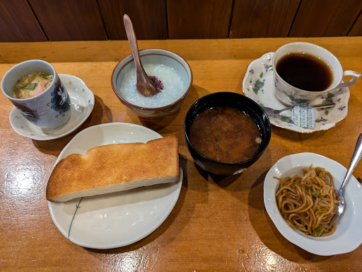 普段はのみやさんということで、特に飲み物のメニューは見当たらなかったのでとりあえず無難にホットコーヒーをセレクトしました。 ゆでたまごか茶わん蒸しですが、この日はゆでたまごでした。 やきそば バタートースト 味噌汁とお粥がついてきます。