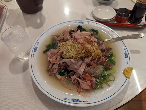 Read more美味しかったです。 学生の頃からありましたが マズいと聞いていて避けてました。 しかーし 友人に皿うどんが美味しいと聞いて1度行ってみたくて行ってきました。 おすすめの皿うどんと気になったトマト天津飯。 あとはニラ餃子。 1人で食べるには金額的とお腹のキャパの都合により、これが限界かと。 ですが 皿うどんて麺うどんちゃうし 笑 めちゃくちゃ中華麺やけど細麺でカリっと部分ありつつモチモチ部分ありーので美味っ! 餡がサラサラの餡で野菜ベースなチャンポンみたいなスープ。 梅干し入ってて潰して味変しながら カラシついてるやつ加えながら微妙にスープに味足して食べてくとあっとゆぅ間に完食。 平たいデカイ皿傾けながら大きなスプーンで最後までピカピカに食べた。 トマト天津飯もデカイ器にドーン! でっかいトマト乗ってて天津飯には見えない。 予想裏切られたのはトマトの中にご飯入ってて卵あんかけの上にご飯いりトマトが餡を被りながら居った。 全く予想裏切られた感激...