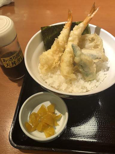 ・味 △ 可もなく不可もなく。 お米はパサパサでいつ食べても不味い。 注文した天丼の写真を撮りました。料理が届いた時に、「具の量が少ない?」と思ってしまいました。メニューの写真と比較したのですが、 写真写りの角度か、、「まあ値段的にこんなもんかなぁ。」という感想。 セットの豚汁は、メインのようで大きかったですが、具材のほとんどが 玉ねぎ...