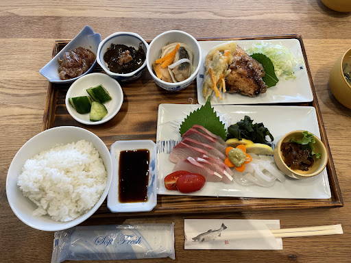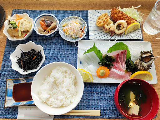Read more9人のおっさんたちで島に行く為、お昼の場所をあらかじめ探し、ここをネットから予約。3人以上とか、いい定食希望の場合は予約して下さいとHPにあった。なので、フォームから。ランチのいい定食まではいいかな、当日選べるならと言うつもりで、定食のところにチェック入れなかったが、当日朝、確認の電話をいただき、ランチの定食と考えて予約となっていたことがわかる。まあそれでもいいので、丁寧な確認電話に感謝し、快諾。こちらの確認不足であった。 郵便局隣の建物で、港から近く、定食も魚が美味しく、お昼から十分に満足。 島では飲食店がそんなに数はないようなので、どの店でも予約確認して行...