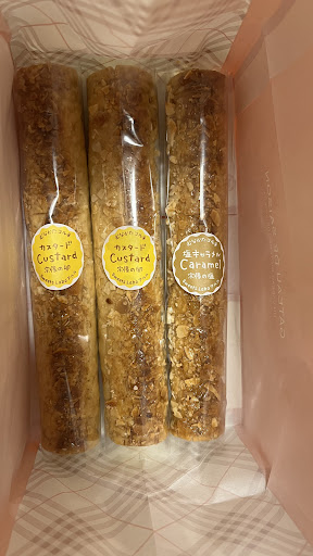 Read more本日、頂き物をしまして食べました。 中のクリーム(カスタードとキャラメル)もさることながら、筒状に焼かれたパイ生地もずっしりとしつつサクサク触感で美味しかったです。 難点はどうしても生地が嚙み切るときに飛び散ってしまうことと中のクリームが反対側から飛び出してきてしまうので、ナイフなどで一口サイズに切るか、包まれているフィルムを駆使して上手に食べるかですかね。 車の中とかで食べたら、車の持ち主から怒られること必至です...
