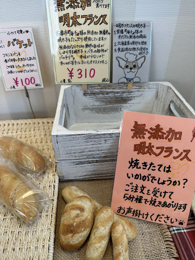 Read more娘と看板を見てふらり行ってきました。明太フランスは注文してから焼きたてを提供してくれます!外カリカリで中はジュワッとして明太子も辛すぎず本当に美味しかったです!あんぱんも好みのこし餡入り。クルミパンもクルミがたくさん入っていてとても美味しかったです。バタールを買うか悩みましたが、気になったので再度戻って購入しました。バタールは1日1本しか焼かないとの事なのでまとめて買いたいときは前日までに予約してくださいねとのこと。ワンちゃん用のパンもあり、うちのワンコにカツオ味のパンを買いました(犬用なので味はすごく薄いけど人も食べれます)お話上手なオーナーさんの優しさが詰まった無添加のパン屋さんで、場所も隠れ家みたいでオススメです!今度は看板犬のハル...