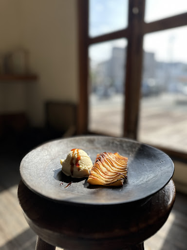 可愛い外観もそうですが、店内の装飾や家具、お皿やカトラリーの細部まで何もかもセンスの良さを感じます。 店主様からゆっくりお過ごしくださいと優しい言葉を頂き とても自由にゆっくり過ごさせて頂きました。 オーダーは訪問前より気になっていたレモンパスタを頂きました。 レモンのさっぱりした酸味と生ハムの塩味がベストマッチで美味しかったです。 そして少しお腹が落ち着いてきたころにアップルパイを頂きました。 このアップルパイがめちゃ美味しかったです。 スライスりんごとパイの焼き具合が絶妙でパリッパリのサックサク これがアイスクリームととても良く合って美味しかったです。