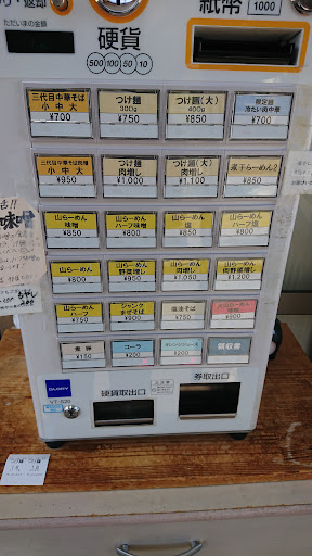 どれを勧められていたのかは忘れてしまったが、掲示されたメニューのシルエットからすると、選ぶべきは『山ラーメン』しかない。 煮卵を追加して、ちょうど千円。 ふだん小銭を持ち歩かない身としては、この端数のない支払いが心地よい。