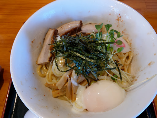 とにかく、美味しいから、行ってみて!と知り合いに言われて、連れと行って来ました。 日曜日の丁度正午in。 数人並んでました。 名前と車のナンバーを書いて、 先に券売機で食べたいラーメンを買って、順番待ちでした。 ラーメンのメニューは、券売機のメニュー表示だけでは、イメージがつかないので、 先にネットとかで、画像を見て行くのがベストのような気がします。 券売機は、○○ラーメンという表示がいろいろあって、 汁なしが食べたい時は、店員さんに、券を渡すときに、汁なしでって、言うシステムのようです。 日曜日でしたので、アルバイトさんでしょうか。 若い女の子が、店に案内するのですが、 これがまた、うつむき加減で、声が小さくて、誰を呼んだのかも分からなかったので、 土日で行く場合は、耳を済ました方が良いと思います。 店に案内されて、席を言われる前に、 店員に、ラーメン券を渡しますが、 その時に、汁なしの場合は、自分から汁なしと言います。店員さんには聞かれなかったので、汁なしを食べたい人は、自分から言えばベストです。 店員さんに、ニンニクの量を聞かれましたが、その声も、聞こえにくくて、3回くらい、聞き返しました。 店の床は油でヌルヌルだったので、気を付けて歩いてください。 ラーメンの味は、 連れは、つけ麺、私は味噌ラーメンの汁なしを食べました。 麺は太麺ストレート、 だったので、備え付けのプラスチックの箸では非常に食べにくかったです。 店の入り口に割り箸がありますので、 必要な人は、最初からそれを使った方が良いと思います。その説明はありませんでした。 味は、つけ麺は、酸味のある醤油、 味噌汁なしは、あまり味噌を感じない、残してしまいました。 好きな人は好きなラーメンだと思います。 一番気になったのは、 店員と店長さんの、いらっしゃいませ、と、ありがとうございました、の、声が小さすぎて、私たちは、たまたまカウンターに通されたから、何となく聞こえたものの、入ってきたお客さん、出ていくお客さんには、絶対聞こえていない、無言で出迎えの店と誤解されそうな感じでした。 あるテレビ番組で、ここの店長さんが、苦労して、やっと軌道にのったと、涙しながら語っていたのを見て、それも気になって来てみましたが、 もう少し、客への感謝と、またきてほしいという気持ちがあるのなら、 元気よく対応す...