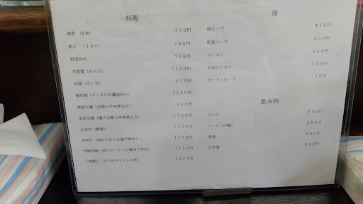 重厚な引き戸を開けると、外の暑さが嘘のように冷房の効いた広い店内が広がっていた。 カウンターに腰を下ろし、メニューを一通り。 本日の気分は――「ラーメン定食(焼き野菜炒め+小ライス付き)」。潔くオーダーを伝えると、厨房奥から品の良いご婦人が現れ、キンと冷えたお茶をサッと差し出してくださった。