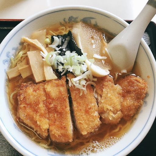 Read more恐山参拝前に美味しいご飯屋さんを探してグーグルマップで評価が高いので訪問。 こういうお店大好きです。喫茶店という枠に収まらないメニューの豊富さ。近所にあったら月に2,3回は行きますね。 地元のお客さんもひっきりなしに来店して、みなさんが色々なメニューをオーダーしています。そのくらい何を食べても美味しいのでしょうね。 今回は、ミックスフライかカツラーメンかで迷いましたが、カツラーメン、連れはラーメンとおかかおにぎりをオーダー。 あっさりスープに肉厚のとんかつがのっているのですが、カツがいつまでもサクサクで美味しい。段々に脂がスープに溶けだしてスープもますます美味しくなるというプラスのスパイラル。 隣の家族連れはアジフライを美味しそうに食べていました。 全部のメニュー制覇したくなるく...