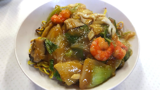 両面焼きそば750円。いわゆる餡掛け焼きそばだが、揚げ麺ではなく中華麺を焼いたものに中華餡掛けが乗っている(揚げ焼きそばは別メニューとして存在する)。具は柔らかに煮えた白菜にチンゲン菜などで野菜多め。トッピングの大ぶりなエビの赤が映える。 贅沢なごちそうとは対極だが、日常の栄養源としては申し分無い。何と言ってもこの諸色高騰の当節にこの値段なら安い。