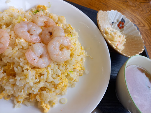 その日の定食はカウンター前に貼ってあります。 いろいろ迷って、海老チャーハン大盛りを注文。 テーブル席と小上がり席あり。