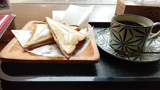 Read moreホットサンド(えびグラタン)。歯ごたえのある大粒のえび、フジッリ(マカロニ)とトロトロのホワイトソースを十二枚切り食パンに挟みホットサンドメーカーで周囲を綴じている。見た目に反して腹が膨れる。 コーヒーは大ぶりで寸胴なマグカップにたっぷり来る(写真を見ていただきたいのだが、カップの径が食パンの一辺の長さとあまり変わらない)。その上おかわりもできる。