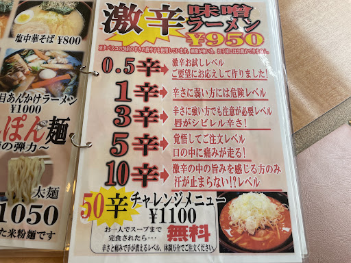 店内に入るなり目当てのメニューは決まっておりましたので席に着くなりすぐ注文。 私は激辛味噌ラーメンの3辛を。 嫁は塩中華そばを注文しました。 過去に獄激辛味噌ラーメンの5辛を食べたのですが胃が痛くなってしまい、それ以来は辞めました^^; ペヤングの極激辛シリーズを全て食べ尽くす辛い物?痛い物?大好きな私ですが、やはり口や喉以外は正常なようです。 毎回食べた後に激痛に悩まされます。笑 なので3辛くらいが自分としてはギリギリ美味しく食べられる範囲内なのかなと思います。 激辛シリーズはここのお店に限らずですが辛味の中に旨味を感じれない人は注文すべきではないです。 ただ辛いだけで終わるのでオススメ致しません。