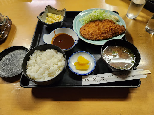 夫婦二人で、口コミを見て初の訪問でした。 週末午後7時過ぎ。それなのに店内は誰もおらず、店主と思われる老夫婦が2人。客席でテレビを観ながらタマネギを切っていました。 きびすを返して帰りたい衝動にかられましたが、せっかく来店したのだから、食べてみなくてはわからない。 と、半ば強引に自分に言い聞かせ着席。 チキンカツ定食とヒレカツ定食を注文。 出てきてびっくり。 チキンカツはハムカツのように薄く、ヒレカツもまるでスーパーの惣菜そっくり。 とりあえず食べ始め、またまたびっくり。 味噌汁が不味い。 なんだかわけのわからない味。 味噌汁色の変な飲み物。 もう、しかたなく食べられるだけ食べ、さっさと帰りました。 残念ですが、二度と行くことはありません。ちなみに、料金は ハムカツ、、、いやチキンカツが1000円。惣菜風ヒレカツが1200円でした。 ...