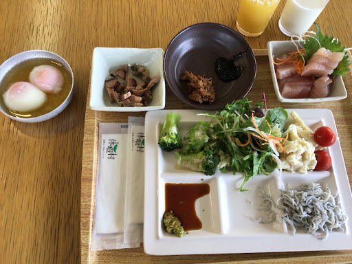 夕食で利用したときのこと…いろんなメニューがあります。そんなに安くはないけど料理素材はいいものだと思う。お刺身はスーパーのより肉厚で美味しかった!懐石料理をお願いしたのですが 他にもサラダやフルーツ、天ぷら、おつけものなどバイキングコーナーもあり、まぐろの切り落としを何度も取りに行って美味しくいただきました! よく注文を聞きに来てくれた「Nさん」という若いお店の人がとてもよく気がつく人で空いたお皿をタイミングよく下げてくれたり、酔っ払ったおばあちゃんの少々乱暴な言い方のお酒の注文も丁寧に受け答えしてくれて...