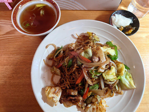 知り合いにオヌヌメして頂いた焼きそば頂きますた 最初にスープとお新香が出て、ちょっとしてから焼きそばが到着 焼きそばの麺は平打中太縮れでしたかな?しっかり焼きで、所々にパリパリに焼かれたトコがあり食感が良いですだ♪ 結構油多めで全体的にしっとり加減だが麺は油を吸っておらずムチッとした食感残してますだね 野菜はしっかり火が通ってるがシャキっとしクタクタしない感じ、肉は細切りのチャーシューかな?硬めだが焼きそばには噛み応えありで丁度良いかも スープは中華風より和風の香りもする不思議な感じ、ラーメンのスープとは違うのか次に...