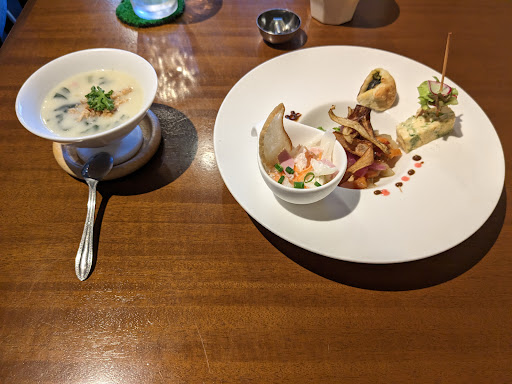 Read more2020·6·25 ランチに行きました。 駐車場には限りがあります。 店内はゆったりとしていて、隣とも離れてるので気にならないです。 帆立のソースが、とても美味しくパンに付けてもgoo。 パンとhot珈琲はお代わりできます。 前菜もメインも野菜が沢山つかってあって、丁寧に作られてました。 パティシエが居ないからケーキ類はないそうです。 平日でしたが満席でした。 2020·9·9 リピーターです。 おおまかディナータイムに食事に来ますが、やはりランチはお得です。 ホット珈琲とパンはお代わり自由で無料ライス付きます。 今回はアップルパイを追加。 メチャクチャ美味しかったです。 ホット珈琲が湯飲みで片手で落としそうで飲みにくいので、マグカップなどにしてほしい。直ぐに飲みたくても熱くて持てない。また、お料理がオシャレな盛り付けなのに合わな...
