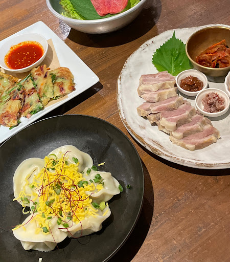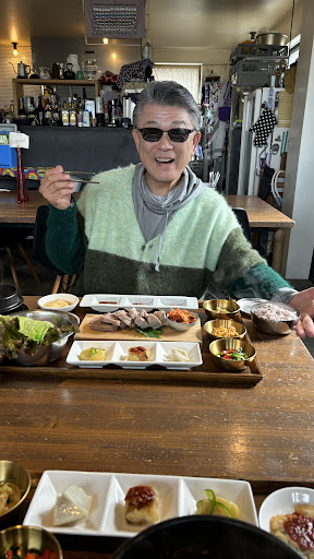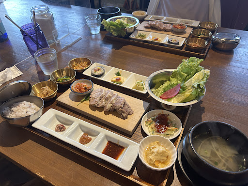 初めて食べましたが、巻く作業に悪戦苦闘しましたが、野菜の甘さがダイレクトにわかったり、豚肉の柔らかさと旨み、ご飯に調味料のコラボがヘルシーなのに、なんとも美味しく、満足できました❗️こんにゃくもスープもチヂミもすべて美味しかったです😍 ドリンクはお茶、麦茶、お水がセルフサービスで店内においてあります。