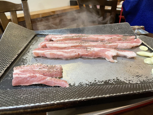 サムギョプサル2人前から注文。2160円。 こんなにボリュームあるとは! 分厚い斜めになった鉄板で、目の前で焼いてくれる。 分厚い豚バラ肉。 いい匂いが漂う〜 油ハネを気遣って、前掛けくれた。 油がすげぇ滴ってる〜 最後、一口サイズにカットしてくれた。
