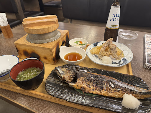【サバの炙り焼き&天ぷら定食】 ⚫︎半身のサバ ⚫︎冷奴(ひと口サイズ) ⚫︎お漬物 ⚫︎天ぷら(かぼちゃ、さつまいも、ゲソ天) ⚫︎お味噌汁 ⚫︎釜炊きごはん