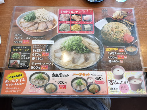 ざっとメニューを見てみると、好きな豚骨ベースの特製らーめんと焦がし醤油の名物チャーハンなる「うま屋セット」がいつもお得の様子。らーめんは大盛に、更に無料のねぎをつけていただきました。