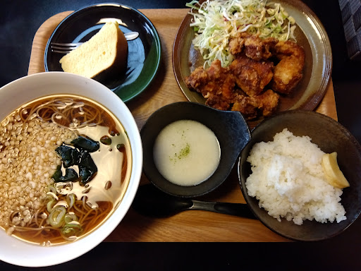 ごん平さんが新店舗に移転し たまたま通りかかりランチを始めた事を知り ランチを食べに行きました 私は唐揚げ定食のランチを 連れは、もつ焼き定食ランチ ご飯も付いているのに そのランチには選べる麺も付いていました (ラーメンor温蕎麦or温うどん)⬅普通に1人前 私は、蕎麦を(ランチでは冷たいのは無く温です) 連れはラーメンをチョイスしました
