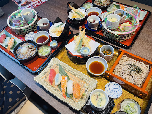 寿司・天ぷら・茶碗蒸し‥ミニデザートまで付いている【彩り寿司和膳】 彩り良く、小鉢もあり大満足なセット✨ サクサク天ぷら・白玉ぜんざいまで絶品♡