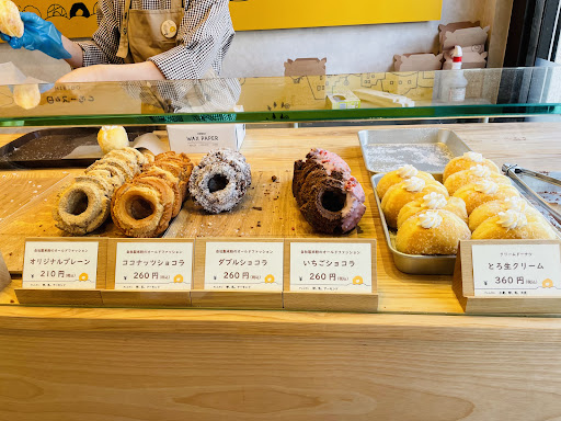 Read more近所で有名になっていたので行ってみました。 オールドファッションを購入しましたが、サクサクとした食感が良かった反面、中がしっとりではなくパサついているように感じました。 バターの香りもほとんど感じず… クリームの入ったドーナツ系数種類(チョコ、とろ生クリーム、チーズクリーム)は甘さ控えめで油っぽさもなく食べやすかったですが、フワフワとした食感というよりはみっちりしてて、ドーナツというよりパンに近いかなと。 チーズクリームがレアチーズに近いような味わいで美味しかったです。 チョコクリームのドーナツはココアが大量にまぶされているせいで生地の風味が一切感じられず、ココアの苦味のみが口に広がったので、粉糖のみにして生地の風味が感じられるようにしたほうがいいのでは?と思いました。 個人的にはもう少しフワフワなドーナツが好きなので、リピートするかと言われると微妙です。