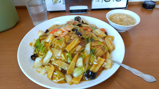 今回は五目焼き揚げそばを注文。大盛り不可。 見た目は多く見えますが、麺は少なめ。 あんは濃いめの海鮮醤油豚肉なし、麺は厨房で揚げてるのか太めの幅広麺。 あまりザクザク感がないので、大盛りにも出来る普通の五目焼きそばの方がいいかも。 やや物足りないかもしれないので、あんの具合を見てライスを追加注文して中華丼にするか麺セットにしましょう。