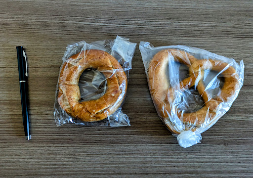 Well, it's the saddest looking bagel I've ever seen - still, I bought it. The pretzel is hard in some parts, so I guess that means it's stale. But the man at the bakery was very kind & friendly. And he seemed very old. The bakery had no other customers, and I was glad I was able to give him some business even though I'm not exactly satisfied with the quality of his bread. I would even come back and buy something else if I lived in this beautiful little city of Nagano because of him. I haven't tried the bagel yet. I'm hoping for good things in the...
