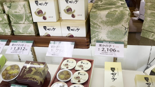 本店に比べ、お客さんも少なくて、ゆっくりお買い物ができます。 ホテルでいただくための栗おこわを購入して、 次の日、おみやげで、くりづとや栗ん子を購入しました。 くりづとは栗がゴロゴロ入っている羊羹。 新栗の羊羹と迷いましたが、くりづとが好きなので、今回もをりづとを購入。 栗ん子は初めて購入しましたが、 小さなお饅頭、お饅頭の皮はひよこ饅頭、なごやんみたいな皮に、くりがいっぱい使用されている栗餡と栗の粒が入っていました。