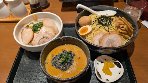 5 stars to this place in Nagano because of accessibility, food choice, taste, and experience. The dining spot is located very close to Nagano Station and can be reached within a minute walk. I also recommend this place for those who can't eat ramen heavily as they are only a few of the joints that offer small-size ramen servings in three variants... Soy sauce, salt, and salt and tomato. My wife was never a heavy eater so she had ordered the small-size ramen with soy sauce. Despite the size, she was able to finish it down to the last drop. The stock used is very tasty and the servings are generous and justly priced. I had a black sesame tsukemen and the dipping sauce is excellently made. The noodles are firm and the pork slices are tasty. Had an extra slice for 110 yen, which I consider cheap. The experience is also great because though the place is not that big, the seating is big enough to accommodate you and your things, as well as your food. Oh, and gyoza here has both pork and veggie variants so it's excellent for those who'd prefer to eat one of those...
