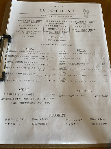 テーブルに置かれてるメニュー表とサイトでの選び方が違っていてわかりづらい ランチメニュー➡️コースの選択 フタリヤorデザートorフォッカッチャ➡️メインの選択 で進みたかった しかも2種あるミートの一つは紙には鶏料理だったのにウェブではロールキャベツになっていた 品切れで切りかわっていたのだろうか?