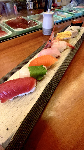運ばれてきた寿司は、細長いお皿に美しく盛り付けられていて、見た目も楽しめます。新鮮なマグロは、2種類。大将によると、それぞれ産地が異なるそうで、ネタへのこだわりが感じられます。他にも、エビ、いくら、卵焼きなど、どれも絶品!特に、卵焼きは出汁がしっかりと染み込んでいて、優しい味わいが口の中に広がります。