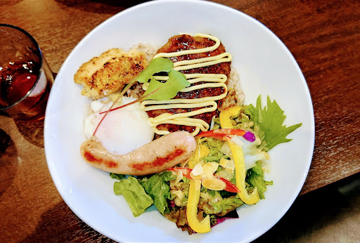 私はミックスグリルボールにドリンクバーとケーキがついてくるランチセットでいただきました。わんぱく丼でした。