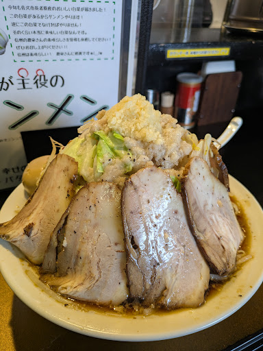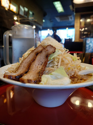 Read more北長野駅そばの人気店。久しぶりに訪問しました。 12時前だったこともあり待たずにカウンターへ。つけ麺と迷いましたが、寒かったのと二郎成分を体が欲していたことから岡村二郎肉増し(1200円)+大盛(180円)+野菜増し(80円)+味玉(150円)で合計1610円(税込)としました。野菜増しが有料なのはマイナスですがこれだけ盛ってこの金額ならまだ良心的と言えなくもないのでは。 有料だけあって野菜の量は本家二郎のマシマシレベル。そこに刻みニンニクとアブラが乗っています。シャキシャキの野菜にスープをかけると美味しい。麺は平打の太麺で量もかなり。終盤かなりこたえました。味玉はトロトロの黄身にいい味が染みており、肉も思いのほか厚みがあってこちらも美味しかったです。 完食したあと丼を見ると結構な油の層が。でもスープ自体はあっさりめで胃もたれすることもありませんでした。 ついつい大盛りにしてしまいますがサイドのご飯類も充実しているので次はそちらもいただいてみたいです。 ちなみに店員さんも皆さん明るく元気で気持ちがいい応対をしてくれます。これ...