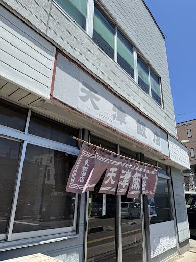 お店は東和田交差点から500m~600m位の距離、「中越」'' なかごえ '' 交差点の角にあります。 昼間の明るい時間は、暖簾(のれん)が出ていない状態だと看板の文字は薄く消えている感じのため店名の判別などが難しい感じですが、暖簾が出されれば、昔ながらの中華料理店の暖簾のイメージとは色あいが少し異なりますが、ワインレッド系の鮮やかな '' 天津飯店 '' の文字入りの暖簾が眼を引きます。