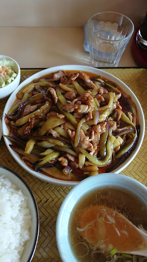 「ナスと豚肉のからし炒め」定食は、他のお客様もオーダーしていて、やはり人気が高いようです。 唐辛子の辛さはさほど強くなく、油との相性バツグンの炒められたナスはトロける食感で、細切りの豚肉とのバランスが素晴らしく店主の腕の確かさを感じます。 豆板醤のコクのあるタレで、ご飯も進むメニューです。