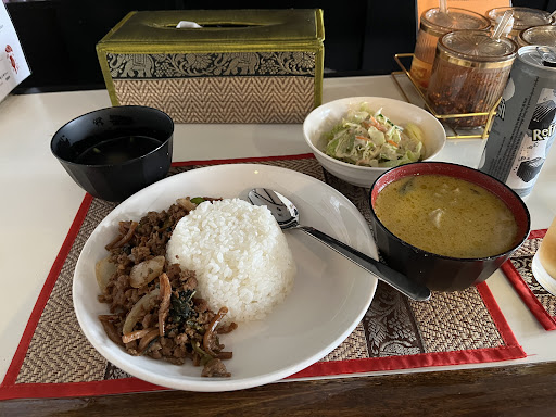 Read moreお店の前に着き、店内が暗いので休みかと思ったらやってました。 カウンター席に座り上を見ると、電気が消えています。 経費削減でしょうか? 目が悪いので見づらかったです。 店主さんは塩対応かと思いきや、ありがとうございましたとタイ式の挨拶をしてくれて素敵でした。 お値段安くてお腹いっぱいになります。 今度は麺類を食べてみたいです。