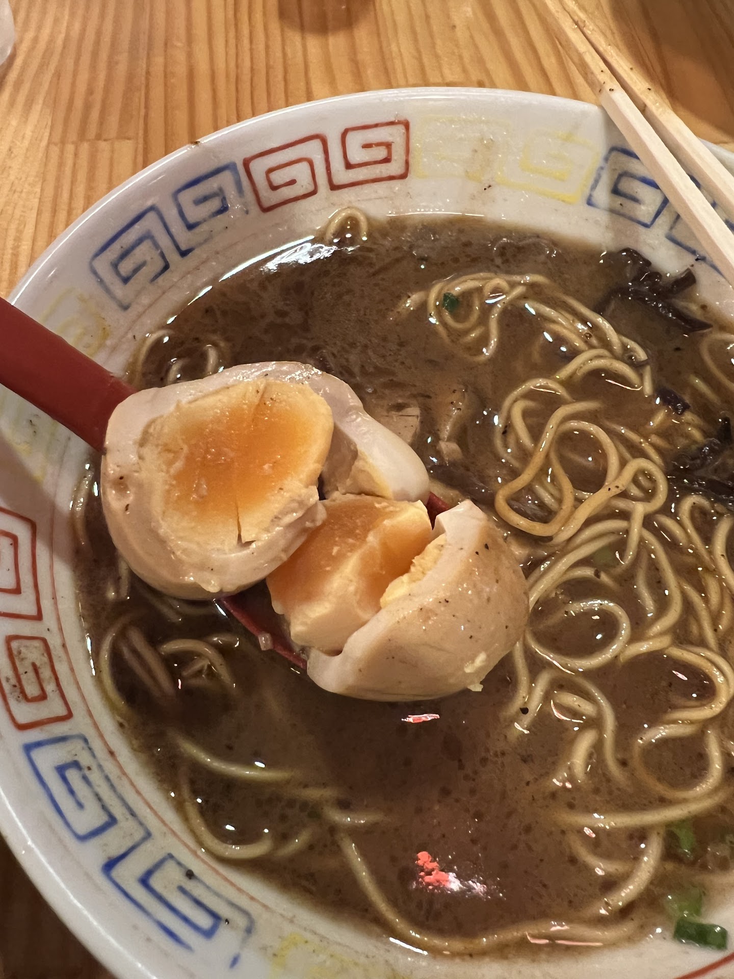 Food arrived (I ordered the garlic oil pork ramen), and it was horrible. Broth was overly salty, the meat was cold. And the ajitama egg was beyond disappointing. It was close to being a hard boiled egg, instead of a runny yolk.